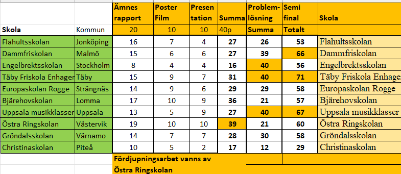 På KTH i Stokholm samlades den 10 april lagen. 4 elever från varje klass (två killar och två tjejer) representerar klassen i semifinalen. Alla elever och lärarna fick varsin plakett. Det är ju en bedrift att komma till semifinalen. Varje klass har arbetat med en fördjupningsuppgift. I år var det Bollramar. Man skull klura ut hur många fotbollar och handbollar man kunde stapla inom ramen. Klassen fick detaljerade instruktioner som skulle uppfyllas och sedan skulle klassen designa två rektangulära bollramar och en icke rektangulär bollram. . Dessutom skulle de göra en plansch med den sistnämnda bollramen. Arbetet med Bollramarna skulle visas med en film som de spelade in. Planscherna sattes upp. Efter lunchen blev det att de olika lagen skulle lösa problem, 8 st på 90 minuter. När de löst en uppgift och lämnat in fick de nästa uppgift att lösa. Efter en rast så hade de olika lagen en muntlig presentation av sina Bollramars design. Det innebär att Bollramarna hade fyra delar, en rapport, en muntlig presentation och film samt plansch. Dessa bedömdes och man kunde få max 40 p. De 8 problemen gav max 5 p vardera så även där fanns det 40 p att hämta in. Här nedan är resultatet av semifinalen.