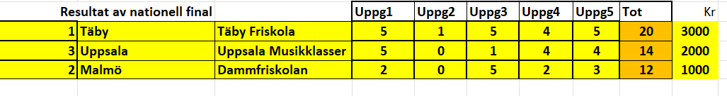 Fredagen den 11 april blev det final mellan de tre bästa lagen totalt, Dammfriskolan, Täby Friskola och Uppsala Musikklasser.